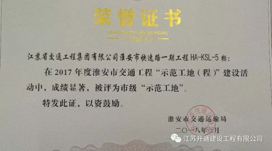 在2017年度淮安市交通工程“示范工地”建设活动中,开通公司快速路5标项目通过全体建设人员的共同努力,精心打造,成绩显著,被淮安市交通运输局评为市级“示范工地”。该项目全体建设人员决心以此荣誉为动力,不辜负各级领导的期望,再接再厉,决战决胜,全面夺取2018年度目标任务的新胜利。(刘建飞)